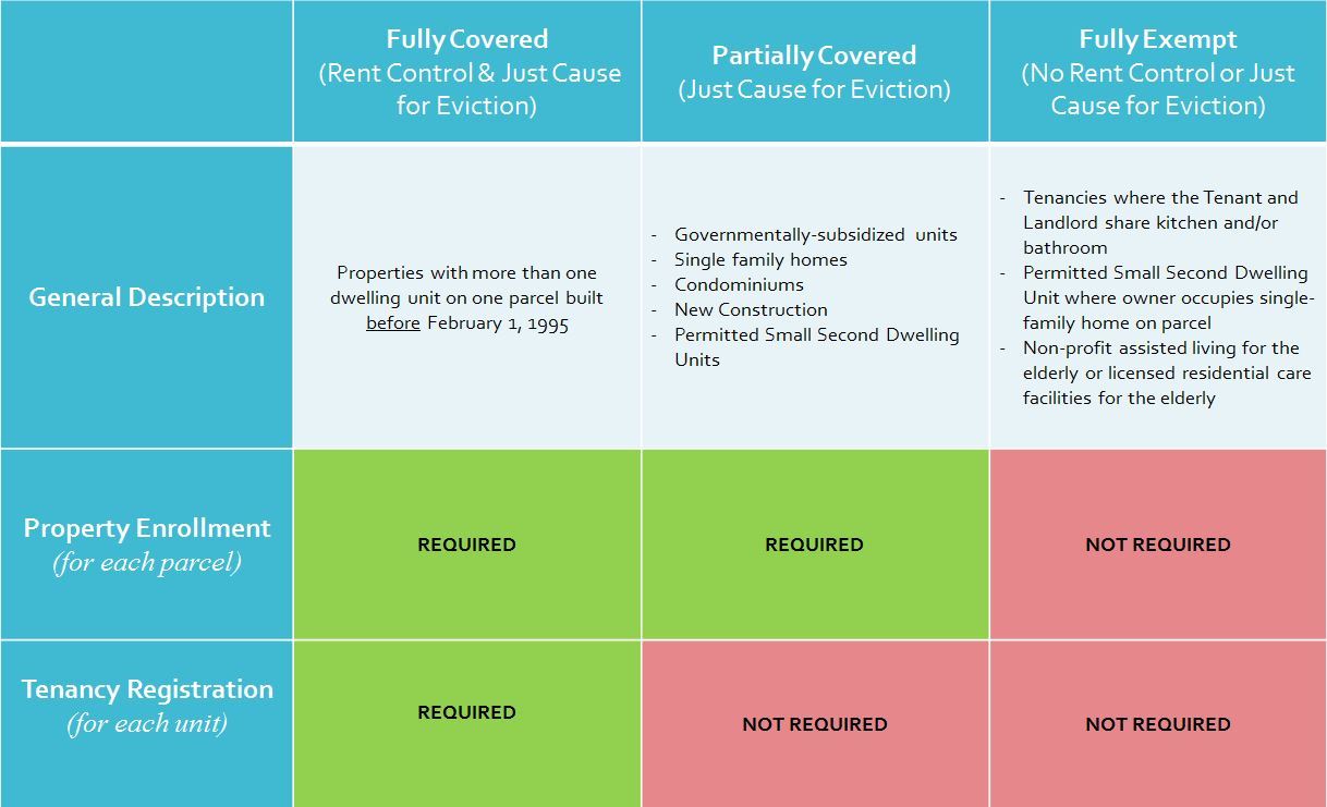 Most of Richmond's residential rental units are covered by the Richmond Rent Ordinance, but not all units are subject to both Rent Control and Just Cause for Eviction Protections. Learn which properties are subject to the Richmond Rent Ordinance and require Property Enrollment and/or Tenancy Registration. Expand the table below: