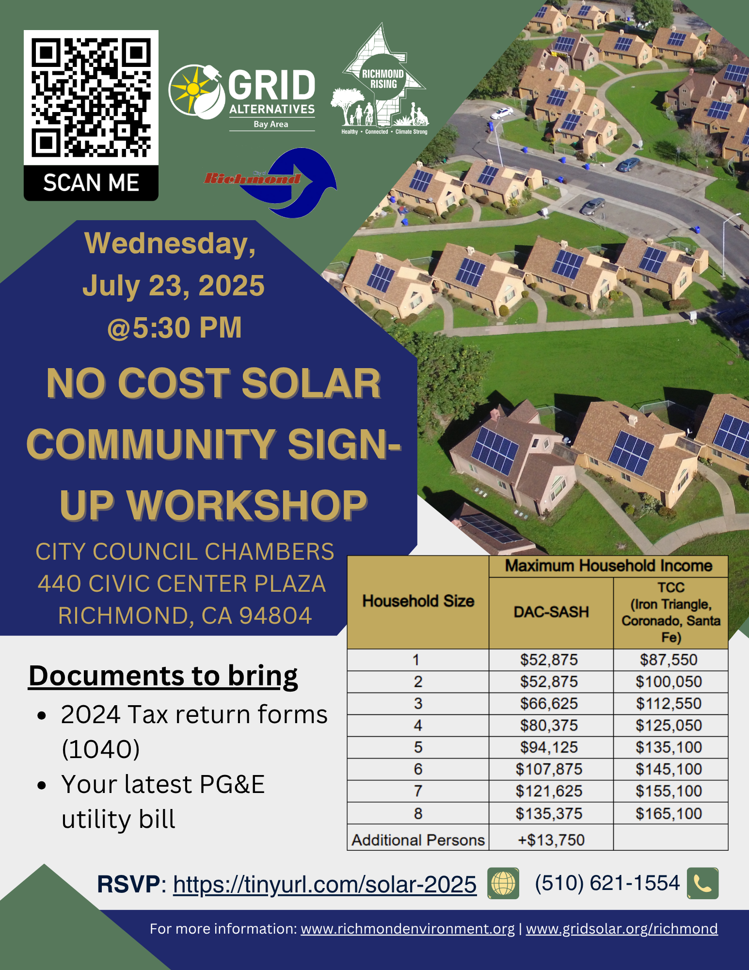 The City of Richmond in partnership with GRID Alternatives invited eligible Richmond and North Richmond Homeowners to GRID Alternatives' Annual No-Cost Solar Sign-Up Workshop on Monday, July 29th, 2024. This annual workshop provides information about the City's no-cost solar program for low-income homeowners, time to answer any questions, and for eligible attendees to sign-up for the program.