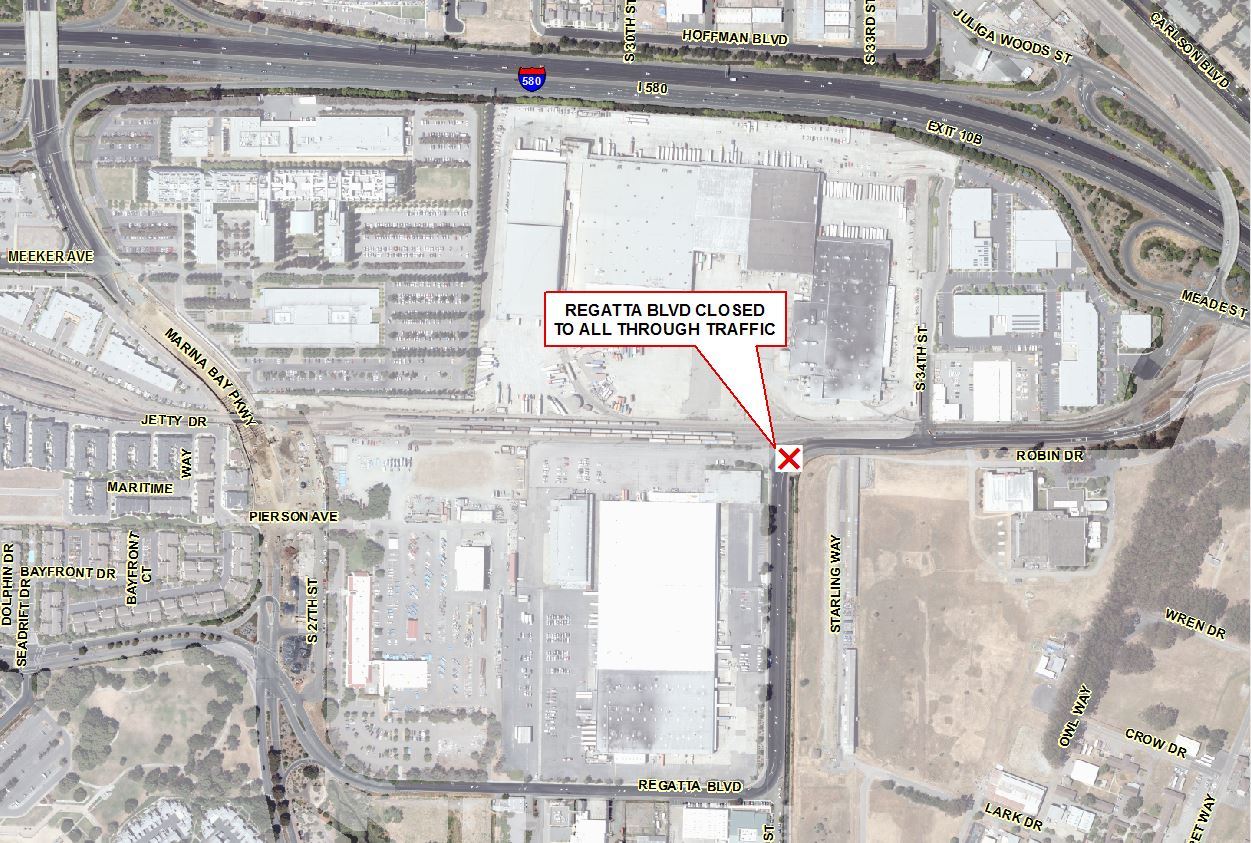 Richmond Police Dept has closed Regatta Blvd completely due to drivers ignoring closure and creating dangerous conditions. Road will be closed for the duration of  construction, at least a month. City of Richmond is installing a hydrodynamic separator, a trash capture device, on a large storm outfall at this location.