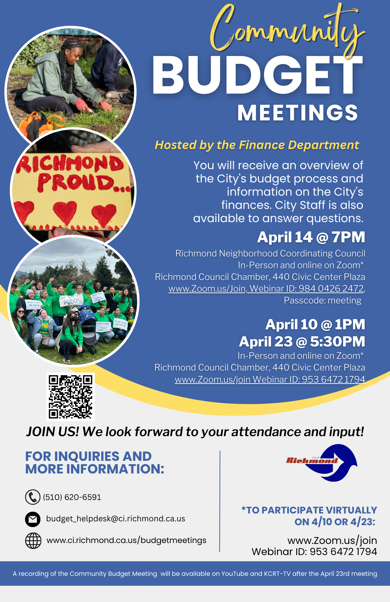 The City of Richmond Community Budget Meetings provides the community an overview of the City’s budget process and the current financial standing.